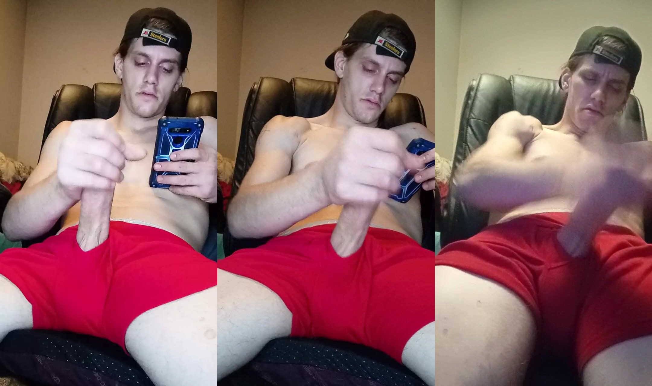 Sunnys hard cock showing threw his boxers and Jerking his thick fat cock into he explodes all over the place.