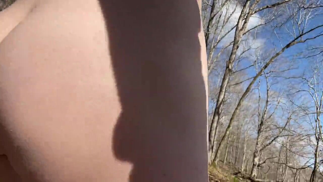 bubble butt femboy outdoors on a public trail walking around naked showing off his juicy bubble butt. He then decides to stop at a fallen tree and sit down and cum all over it for people to see