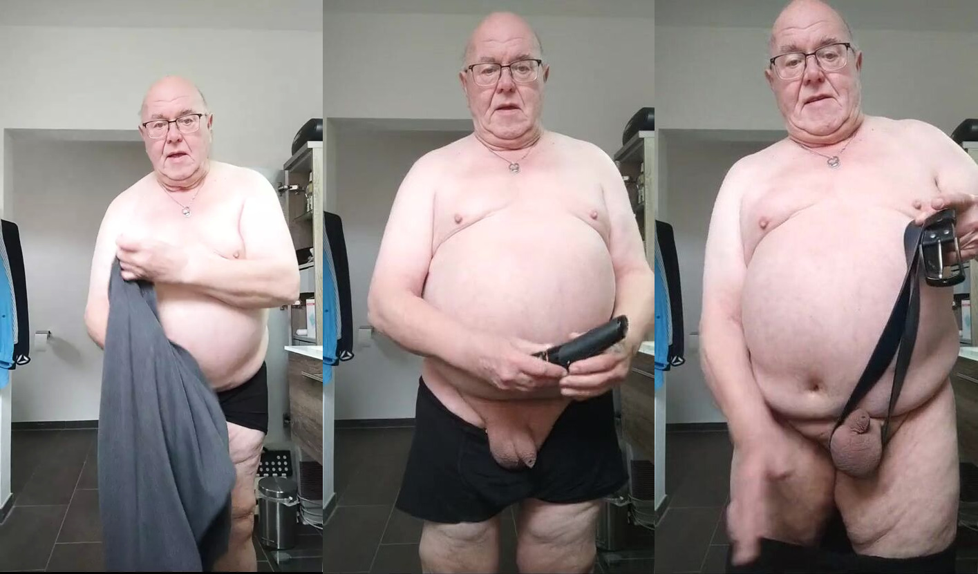 Horny before dressing while shaving i played with my cock and tits. Changing trousers gave my belt the chance to dance on my back, ass and breasts.