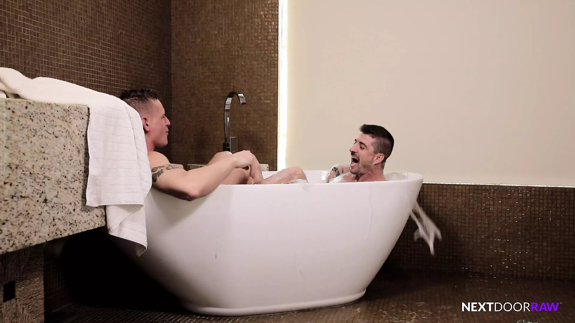 Gunner wants to shower but Sean Maygers used all the hot water for his bath. He jumps in to cool off, and they head to the bedroom. They play fight and Sean shoves his huge cock up Gunner's butt!