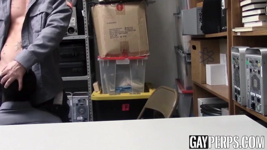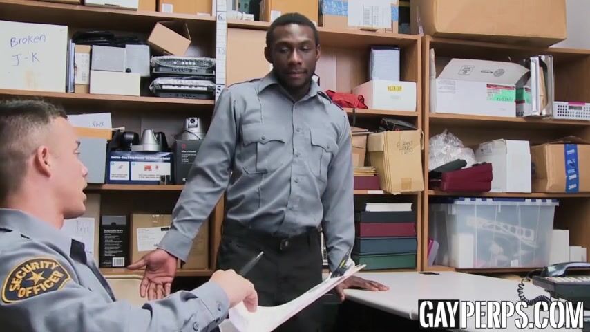 Poor performing ebony security officer gives his colleague a sloppy blowjob before being barebacked.