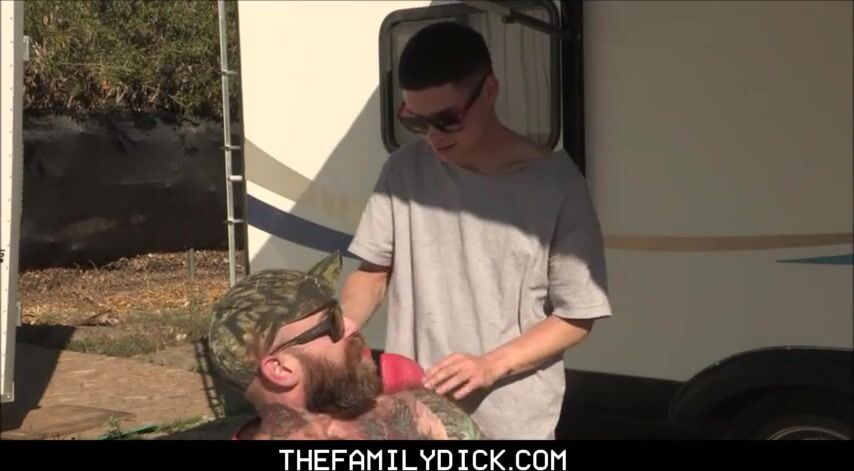 When daring Dylan’s tatted stepdaddy asks him to rub some oil on his strong body, the little guy suggests that the old man fuck him right there in the middle of the trailer park! The big guy is afraid