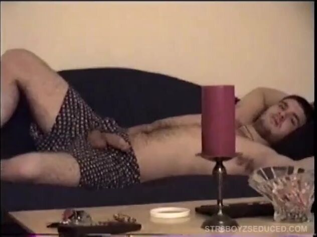After picking up a uniform for his new security job, C.J. drops by Vinnie's to try it on and see his reaction. Vinnie decides to fulfill his fantasy and C.J. seems approachable. Vinnie sets him up in the bedroom, with a porn video playing. C.J. pulls off his pants and starts stroking. Vinnie grabs his cock and C.J. stays hard, so he goes down on him, and he doesn't resist. After stroking for while, Vinnie takes over, finishes him off and swallows his cum load.