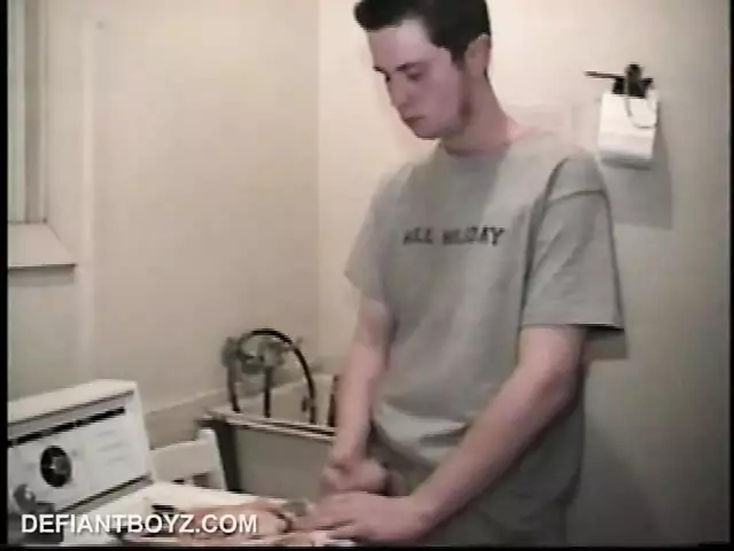 This boy-next-door spreads his new straight porn magazine on top of the washing machine and pulls his cock out of the fly of his baggy shorts, not even letting his balls out to play. Nick's fleshy cock turns out to be a big one, with a nice curve and pronounced veins. His approach is quiet, steady and all about busting his nut. After he blows a big load, he scoops it up for a taste.
