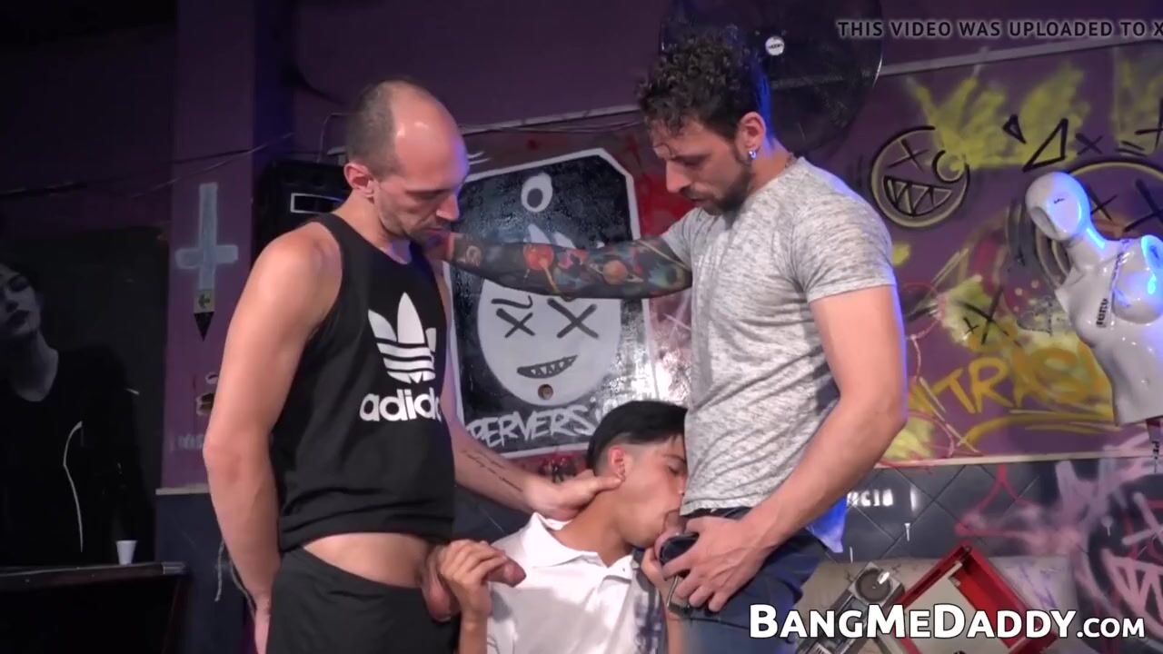 Young skinny dude having bareback sex with two tattooed stepdaddies. Twink drowns in cock while being banged like a dog.