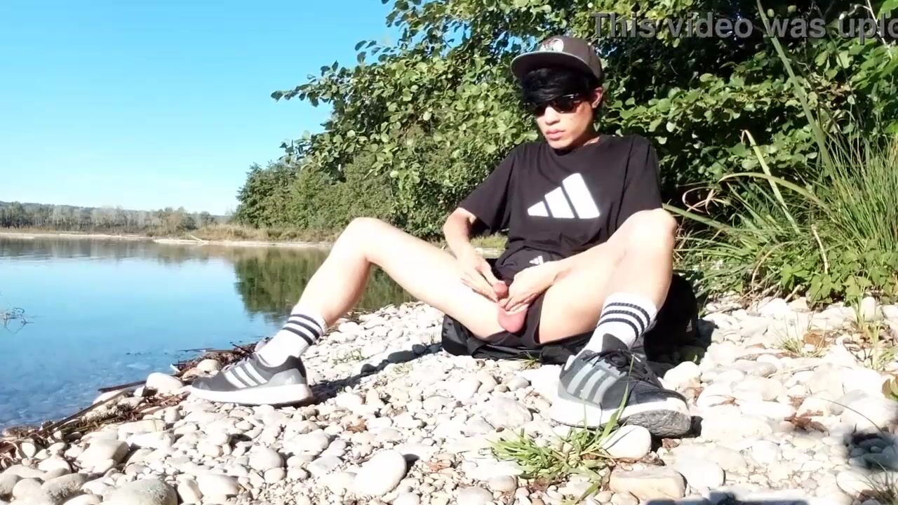 Sexy twink jerks off, cums on his leg, Jon Arteen is a sexy Asian boy who wears an Adidas black tshirt, short short, white socks, sneakers